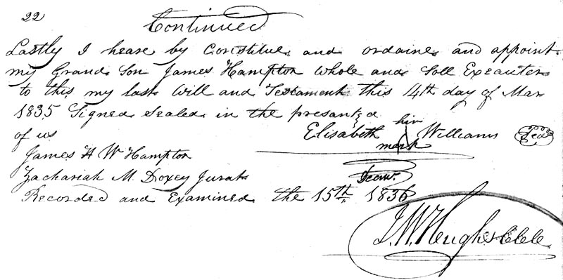 Lastly I heare by constitue and ordaine and appoint my Grand Son James HAMPTON whole and Sole Executer to this my last will and Testament this 14th day of Mar 1835.