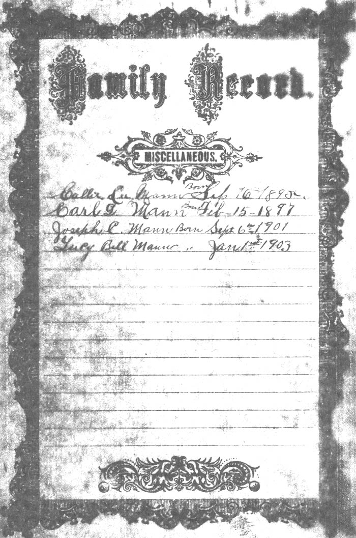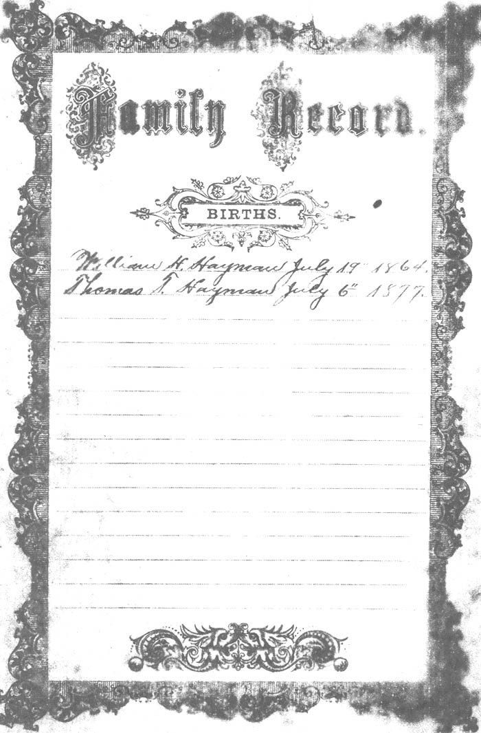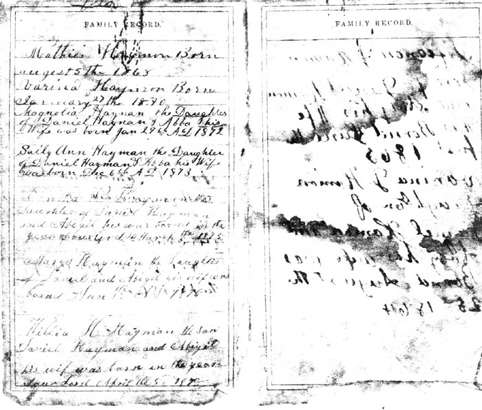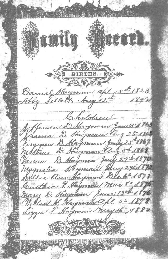 Mathias Haymon Born augest 5 the 1868 Varina Haymon Born January 27th 1870 Magnolia Hayman the Daughter of Daniel Hayman & Abba his Wife was born Jan 29th AD 1872 Sally Ann Hayman the Daughter of Daniel Hayman & Abba his Wife was born Dec 6th AD 1873 Cintha P. Hayman the Daughter of Daniel Hayman and Abigil his [wife] was bornd in the year of our lord March 8th 1875 Mary Hayman the Daughter of Daniel and Abigil his wife was bornd Jun 13th AD 1876 Willie H. Hayman the son [of] Daniel Hayman and Abigil his wife was born in the year of our Lord April 5th 1878 |
