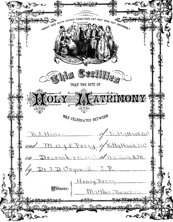 | This Certifies that the rite of Holy Matrimony was celebrated between B.J. Hines of Kitty Hawk, N.C. and Mary E. Perry of Kitty Hawk. N.C. on December 18, 1898 at 11 o'clock A.M. by Dr. J.D. Cogswell, J.P. Witness: {Henry Perry {Matthias Beacham |