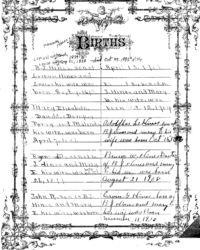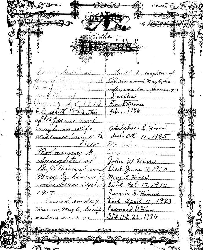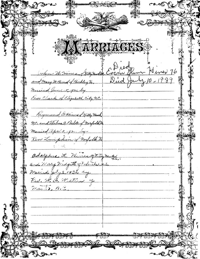 MARRIAGES John W. Hines of Kitty Hawk, N.C. and Mary W. Bond of Berkley, Va. Married Jan. 15, 1921 by Rev. Clark of Elizabeth City, N.C. Raymond D. Hines of Kitty Hawk, N.C. and Thelma A. Belote of Norfolk, Va. Married Apr. 3, '92 (sic) [according to the 1930 Norfolk, Co. census the marriage occurred c1922] by Rev. Lampkin of Norfolk, Va. Adolphus L. Hines of Kitty Hawk, N.C. and Mary Midgett of Rodanthe, N.C. Married July 2, 1932 by Rev. W.F. Walters of Manteo, N.C. Died Ervin Glenn Hines [age] 76 Died July 10, 1989 |