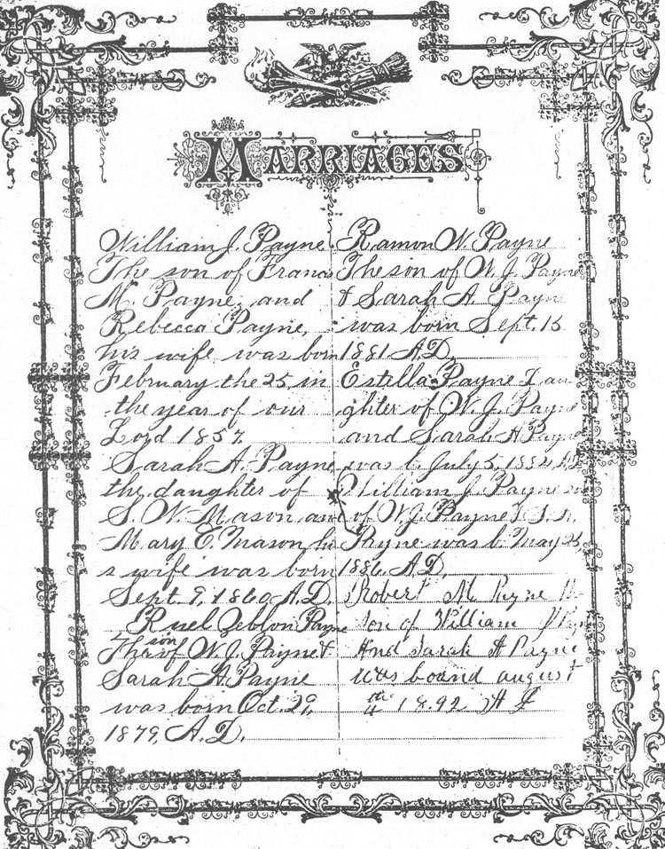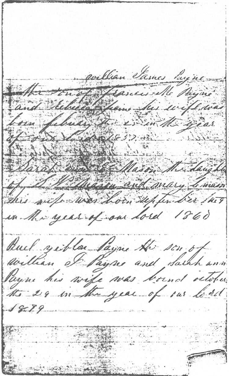 in the year of our Lord 1857 Sarah A. Payne the daughter of S.W. Mason and Mary C. Mason his wife was born Sept. 9, 1860 A.D. Ruel Zeblon Payne The son of W.J. Payne & Sarah A. Payne was born Oct. 29, 1879 A.D. |