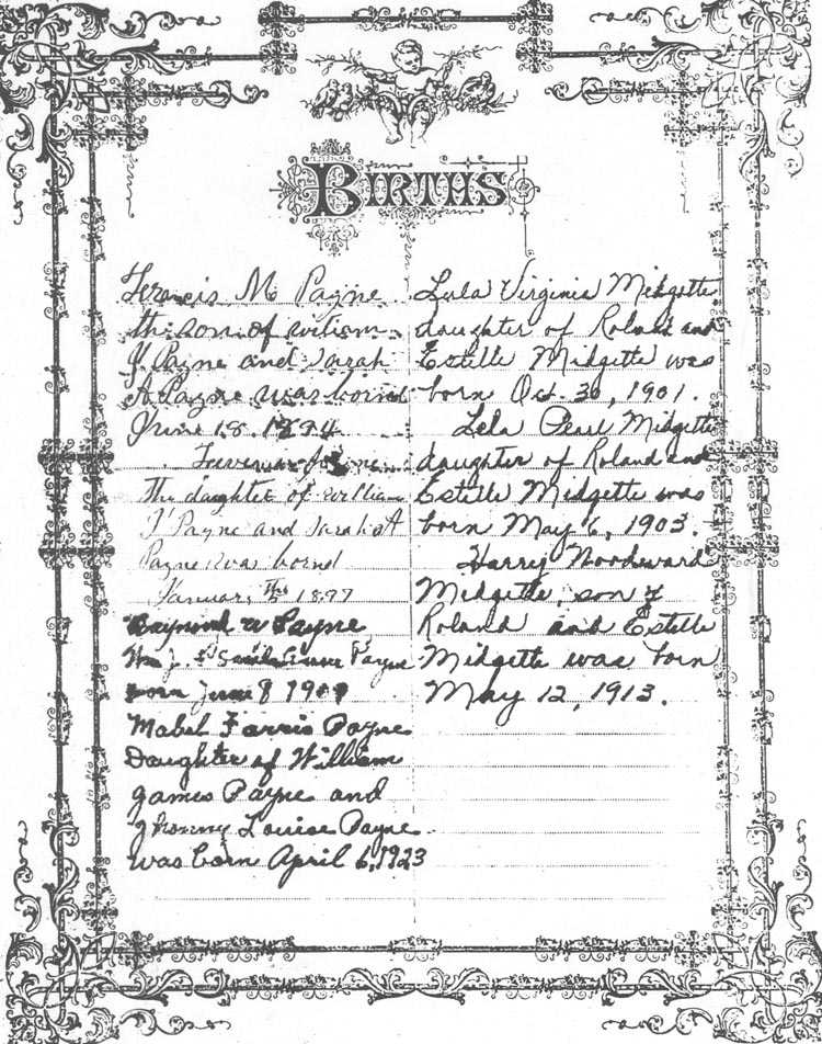 Wiliam J. Payne and Sarah A. Payne was bornd June 18, 1894 Levenia Payne the daughter of William J. Payne and Sarah A. Payne was bornd January 5th 1897 Raymond W. Payne [the son of] Wm. J. & Sarah Anner? Payne born June 8 1901 Mabel Farris Payne Daughter of William James Payne and Jhonny Louise Payne was born April 6, 1923 |