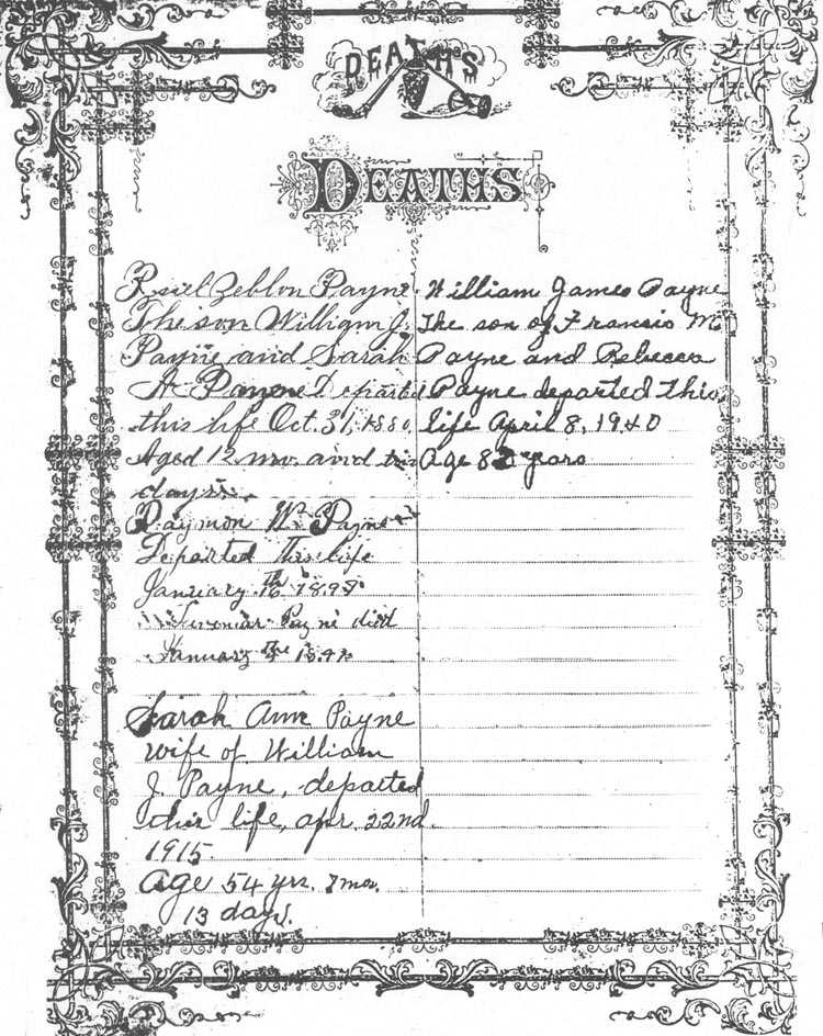 & Sarah A. Payne was born Sept. 15, 1881 A.D. Estella Payne Daughter of W.J. Payne and Sarah A. Payne was b: July 5, 1884 A.D. William J. Payne son of W.J. Payne & S.A. Payne was b: May 23, 1886 A.D. Robert M. Payne the son of William J. Payne and Sarah A. Payne was bornd august 4th 1892 AD |