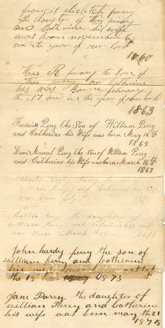 francis elizbteh perrey the daugter of Wm Perrey and Cathrine his wife was Born november 6 and in the year of our lord 1860 Wm R. perrey the Son of Wm perrey and Cathrine his [wife] was Borne febuary the 17 and in the year of our lord 1863 Fredrick Perry the Son of William Perry and Catherine his Wife was born May 16th 1864 Levi Murrel Perry the Son of William Perry and Catherine his Wife was born March 16th 1867 Charles Bayley Perrey the son of William Perry and Catherine his Wife was Born July 9 1870 Matilda Perry the daughter of William Perry and Catherine his wife was Born March 16 1872 John hardy perry the son of William