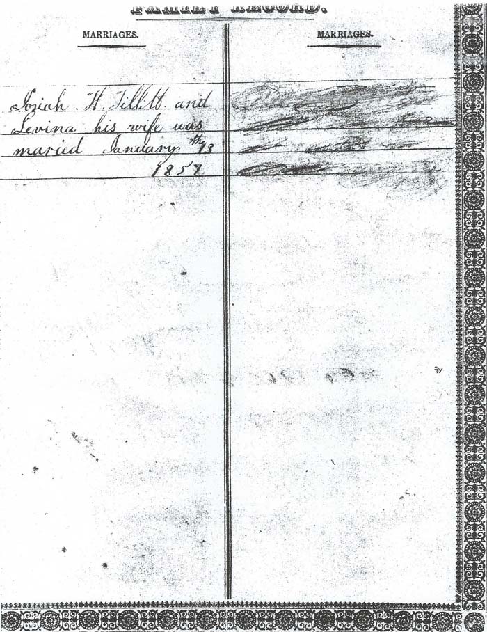 Josiah H. Tillitt and Levina his wife was maried January the 13 1857 [Marriage Book A; pg. 47 shows the marriage date as January 13, 1858 between Josiah H. Tillott and Levina A. Harris] [see actual entry of marriage] |