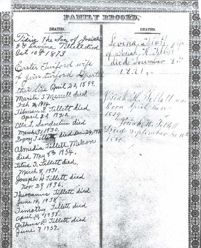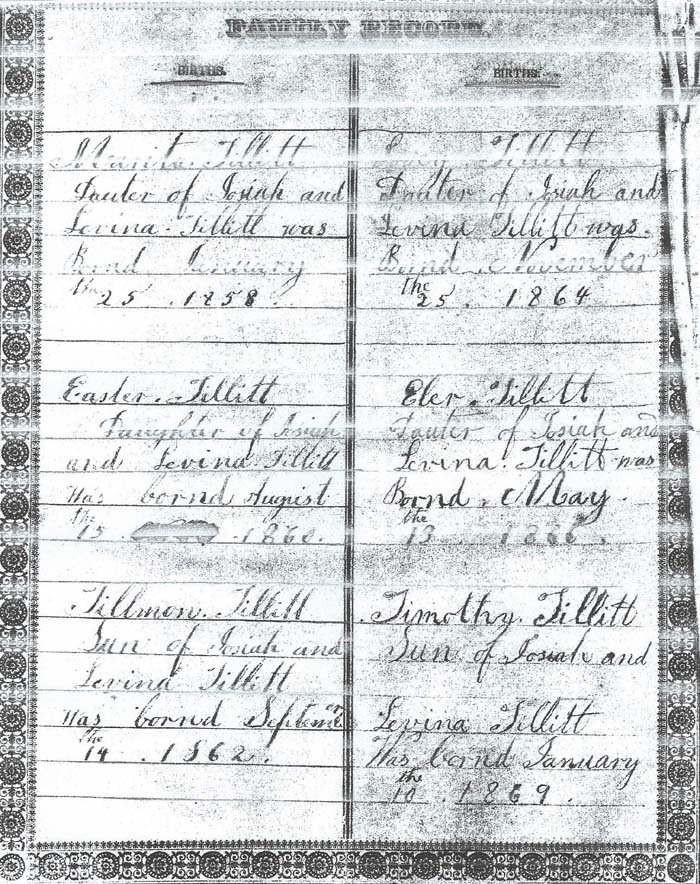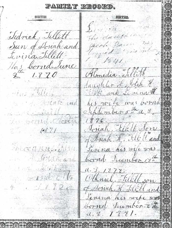 Births Tedrick Tillitt Sun of Josiah and Levina Tillett Was bornd June the 2 1870