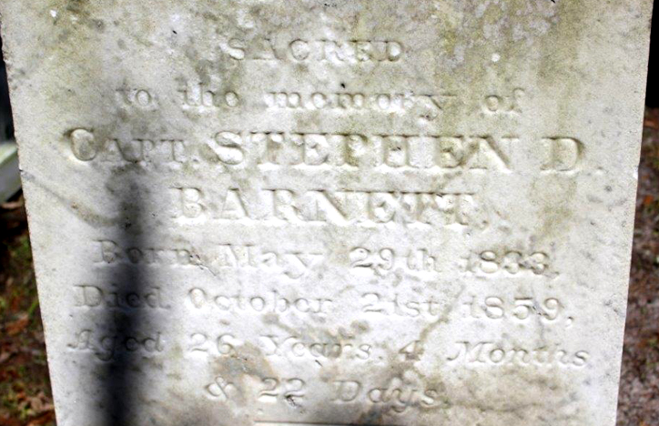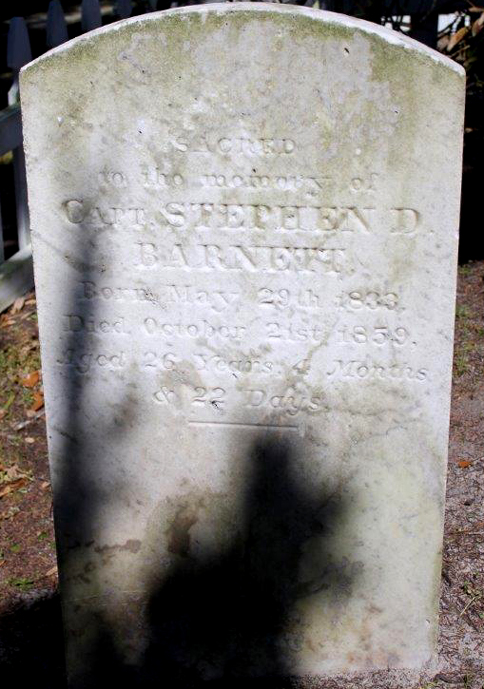 | Barnett, Capt. Stephen D. | May 29th 1833 | October 21st 1859 | Sacred to the memory of - Aged 26 Years, 4 Months & 22 Days [Closeup] | ||||||