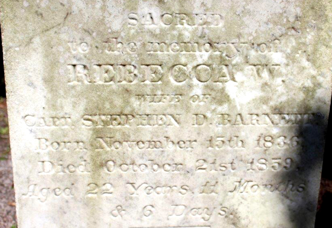 | Barnett, Rebecca W. | November 15th 1836 | October 21st 1859 | Sacred to the memory of - Aged 22 Years, 11 Months & 6 Days [Closeup] | ||||||