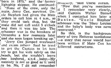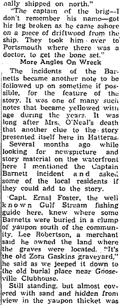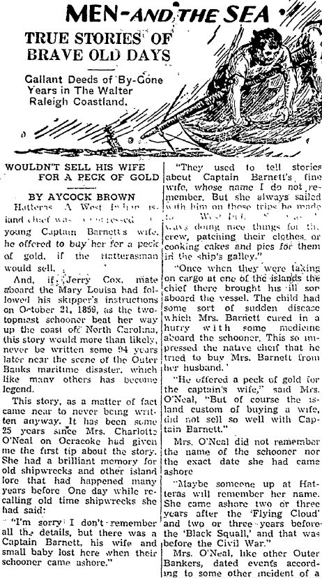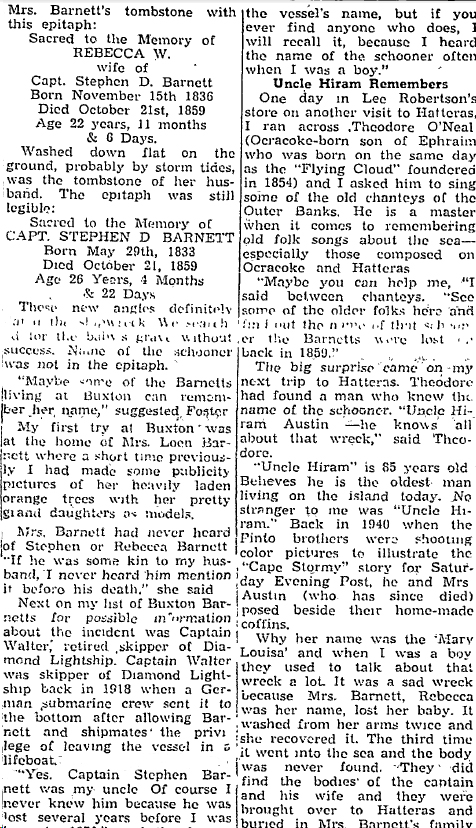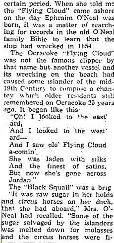 NOTE: Stephen D. Barnett married Rebecca W. Gaskins, daughter of Zorabable Gaskins & Margaret "Peggy" Ballance, in Hyde County, NC on July 9, 1857. The Flying Cloud, mentioned in the articles below, wrecked in 1854, the same year that Ephraim O'Neal was born. The Black Squall wrecked on April 19, 1861 at Ocracoke. You can read about the Black Squall here.