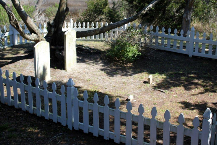 From Hwy. 12 in Hatteras go toward the ferry dock and turn in at the Holiday Inn. The cemetery is under a large cedar tree and can be reached by walking to it from the bridge across the lowland behind the hotel. Google Maps for the cemetery. Photographs were taken in April 2014 by Candy Roth. The cemetery is fenced and well maintained.