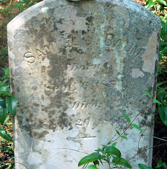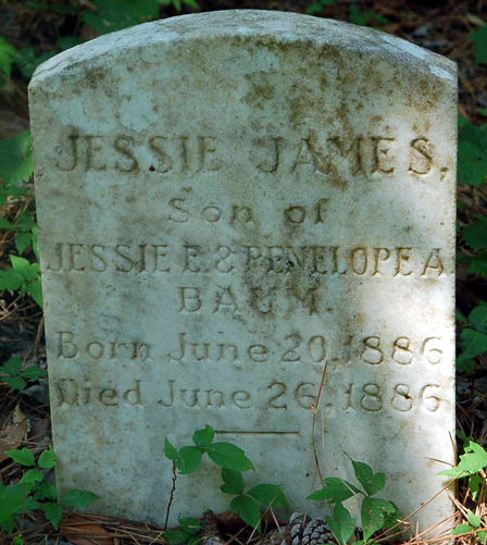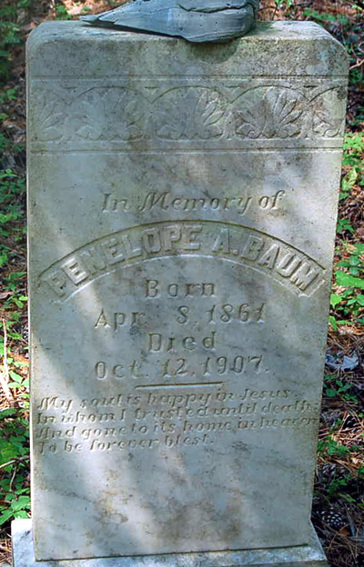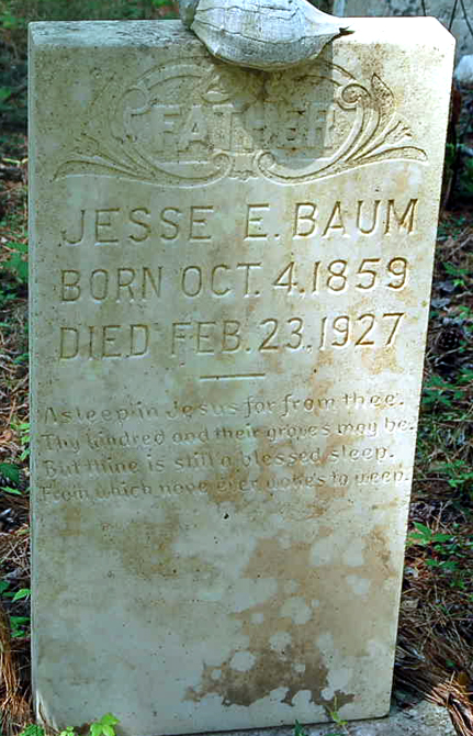 NAME BIRTH DEATH COMMENTS Baum, David March 1845 February 3, 1923 [David was probably a black slave. In 1900 David's birthdate is given as Mar. 1847 and he's a servant in the home of Isaac E. Tillett; in 1910 & 1920 he's living in the home of Jesse E. & Penelope (Tillett) Baum] Baum, Jesse E. Oct. 4, 1859 Feb. 23, 1927 Father - Asleep in Jesus far from thee. Thy kindred and their graves may be. But thine is still a blessed sleep. From which none ever wakes to weep. [Jesse Etheridge Baum was the son of Norris H. & Nancy Baum. Jesse married Penelope Ann Tillett in Nags Head on Aug. 14, 1879. Baum, Jessie James June 20, 1886 June 26, 1886 Son of Jessie E. & Penelope A. Baum Baum, Nancy Aug. 6, 1824 Oct. 18, 1886 In memory of - Aged 61 yrs. Baum, Norris H. Dec. 15, 1815 Oct. 12, 1879 [Norris Baum was the son of Azariah & Sarah (Midgett) Baum. He married Nancy Gaylord c1847. The 1880 Mortality Census shows that Norris' occupation was raising stock. The cause of death was drowning.] Baum, Penelope A. Apr. 8, 1861 Oct. 12, 1907 In Memory of - My soul is happy in Jesus, In whom I trusted until death. And gone to its home in Heaven, To be forever blest. [Penelope Ann was the first child born to Isaac Irby Tillett, Jr. & his 1st wife Harriett Ann Mason.] Baum, Samuel J. Sept. 6, 1854 Sept. 20, 1866 [Son of Norris H. & Nancy (Gaylord) Baum]