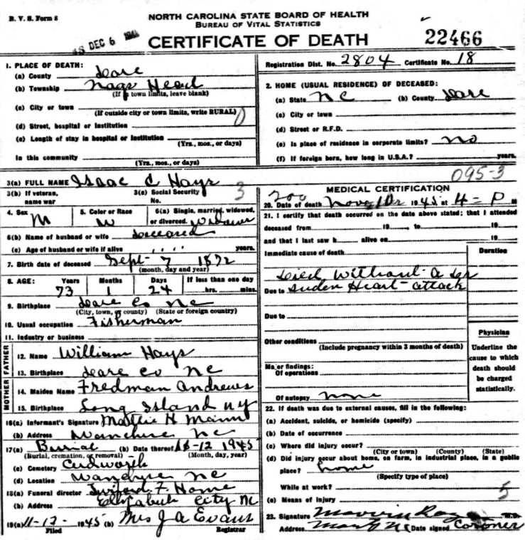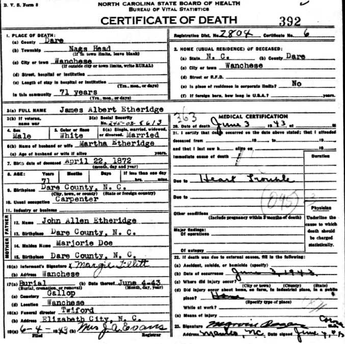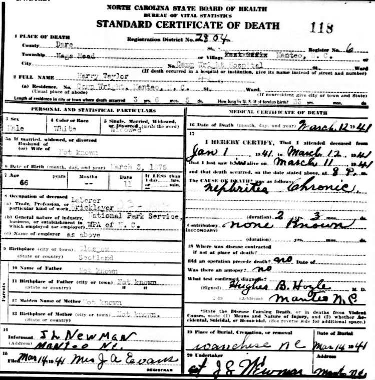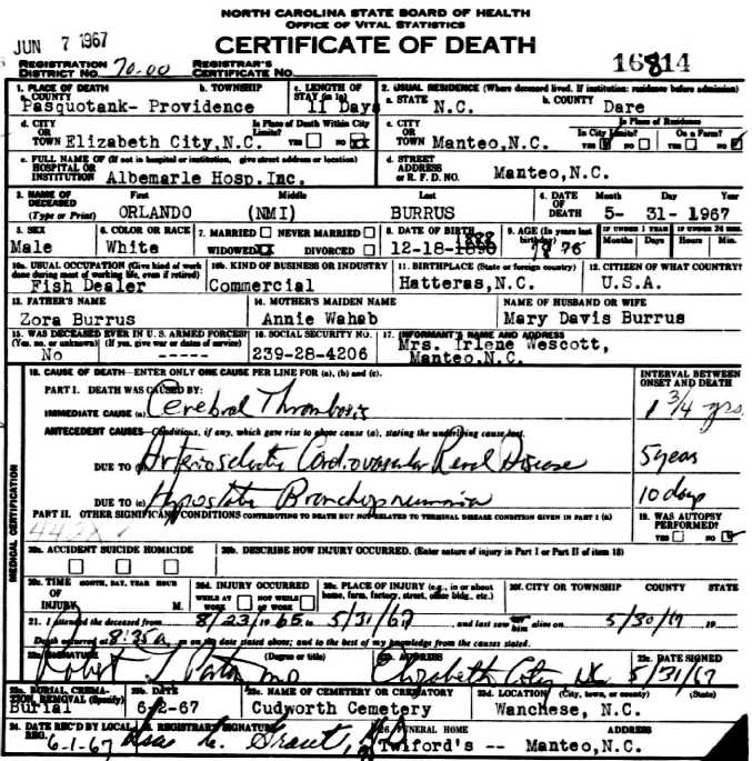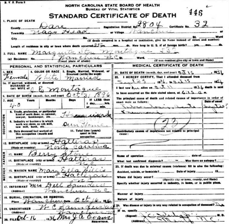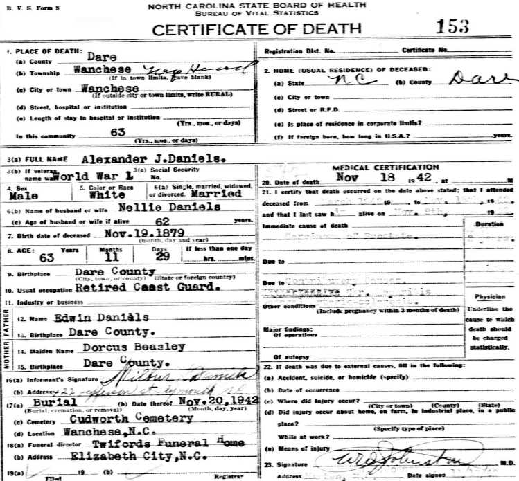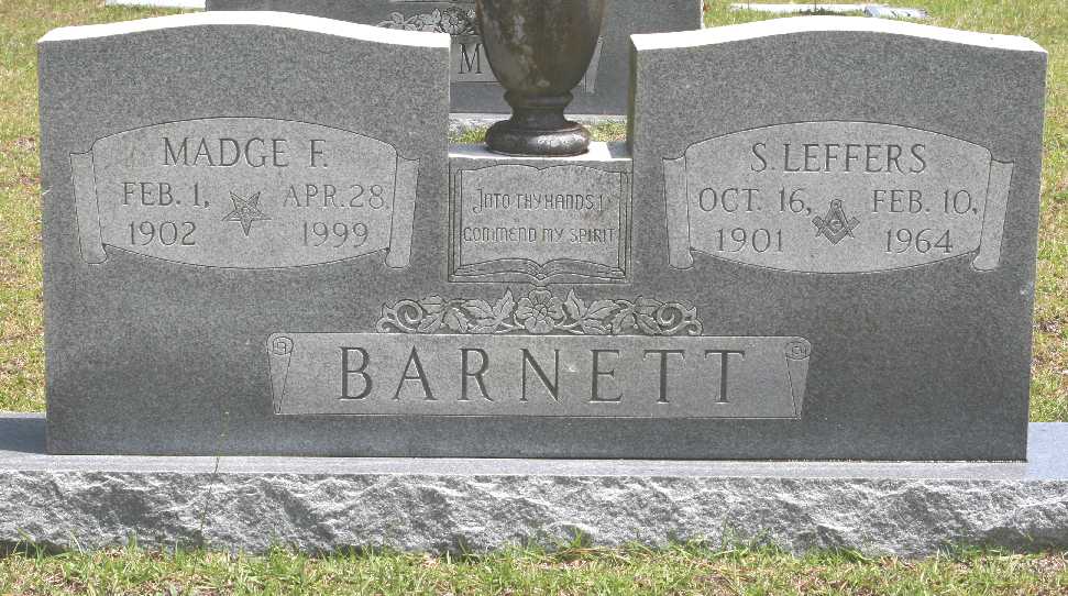 Into Thy hands I commend my spirit [Double with Madge F. Barnett] Masonic Emblem His obituary states he was buried in Mt. Olivet Cemetery in Manteo.] |