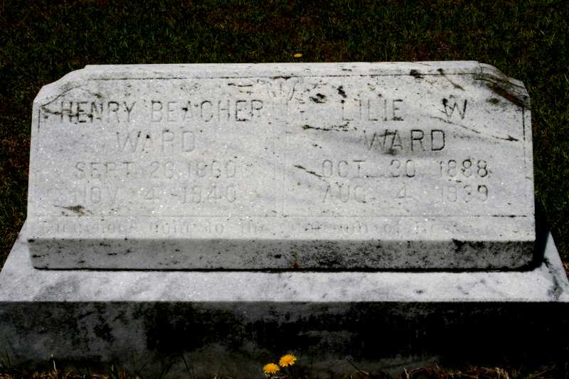 | Ward, Lilie W. | Oct. 30, 1888 | Aug. 4, 1939 | [Double with Henry Beacher Ward] [Epitaph unreadable] |