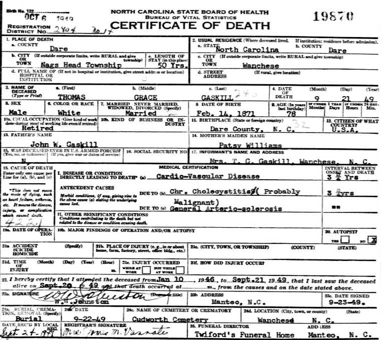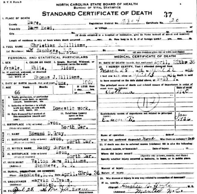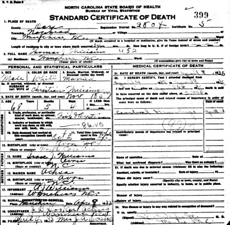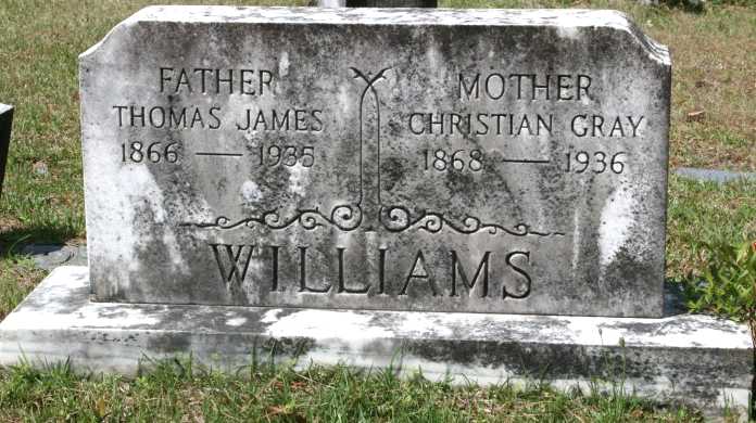 | Williams, Thomas James | [Nov.] 1866 | [Apr. 8] 1935 | Father [Double with Christian Gray Williams] [Death Certificate states birth as Nov. 1857 - Age 68 yrs, 5 mos, 4 days at death ; 1900 census states Nov. 1866] |