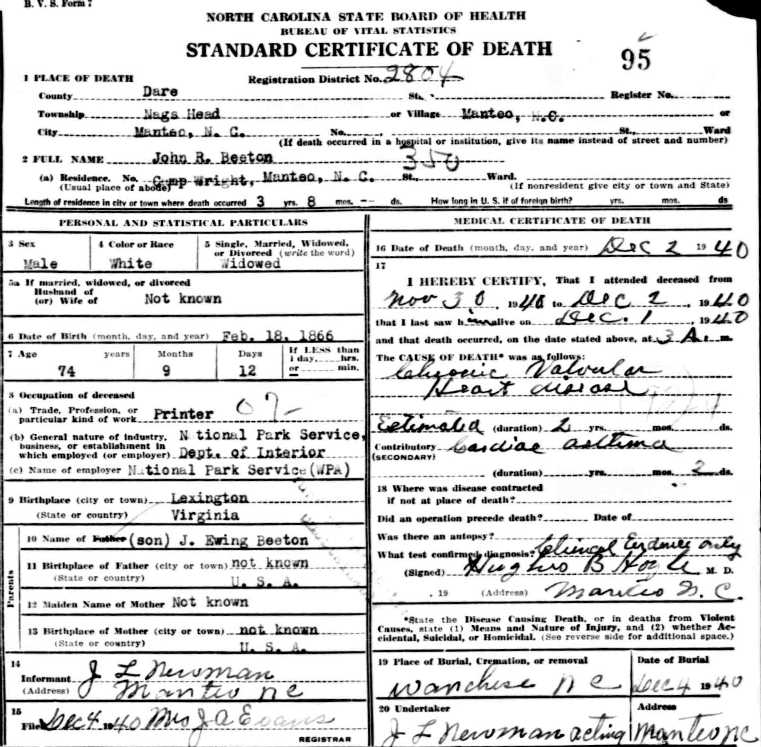 | Beeton, John R. | Feb. 18, 1866 | Dec. 2, 1940 | [Memorial to homeless men who died in work camps] [Death Certificate] |