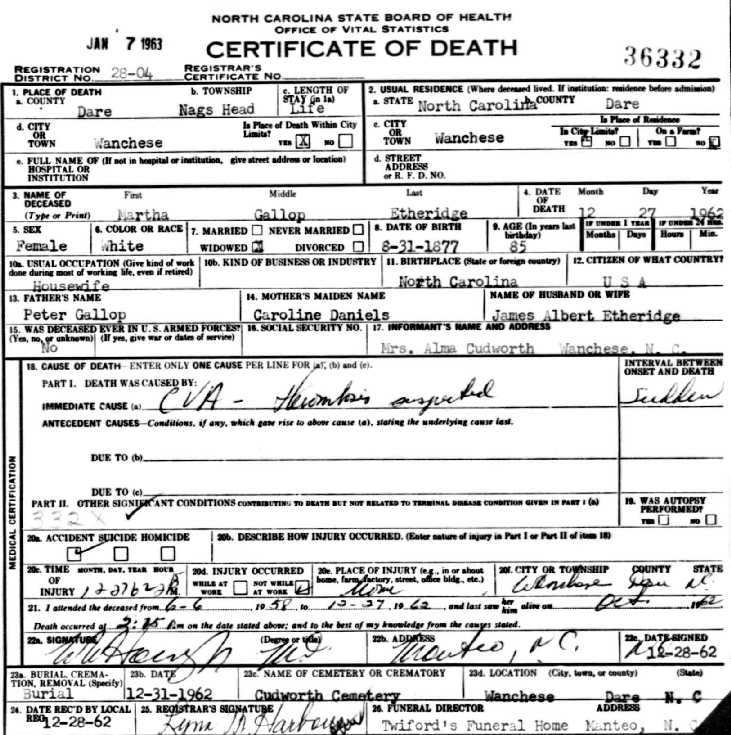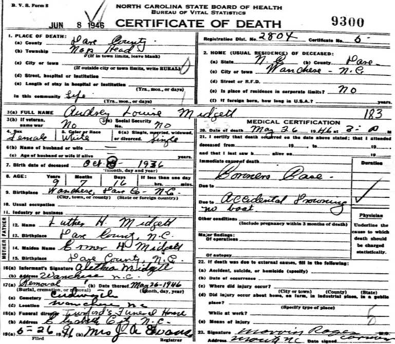Directions: From Hwy. 345 in Wanchese, take Old Wharf Road (SR 1168) and go about 0.1 mile. Take Cudworth Cemetery Road on the right and go about 0.1 mile to the cemetery. Google Maps for this cemetery.