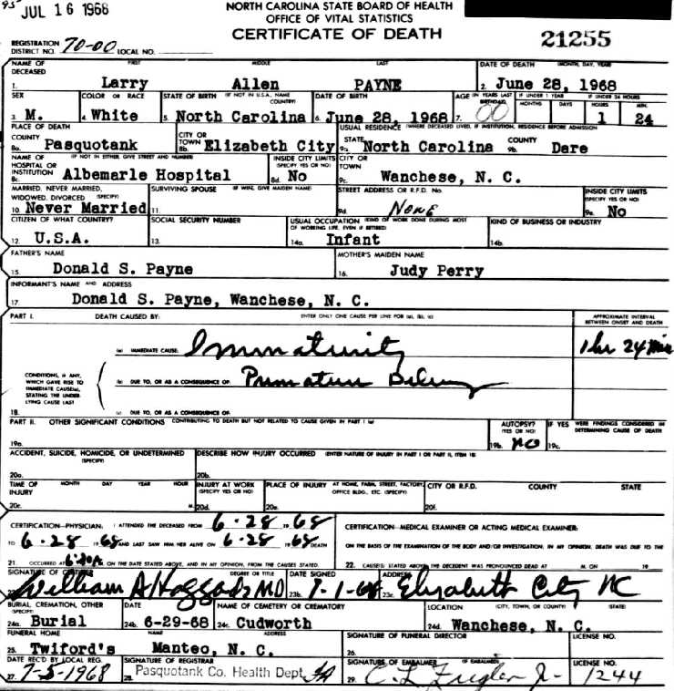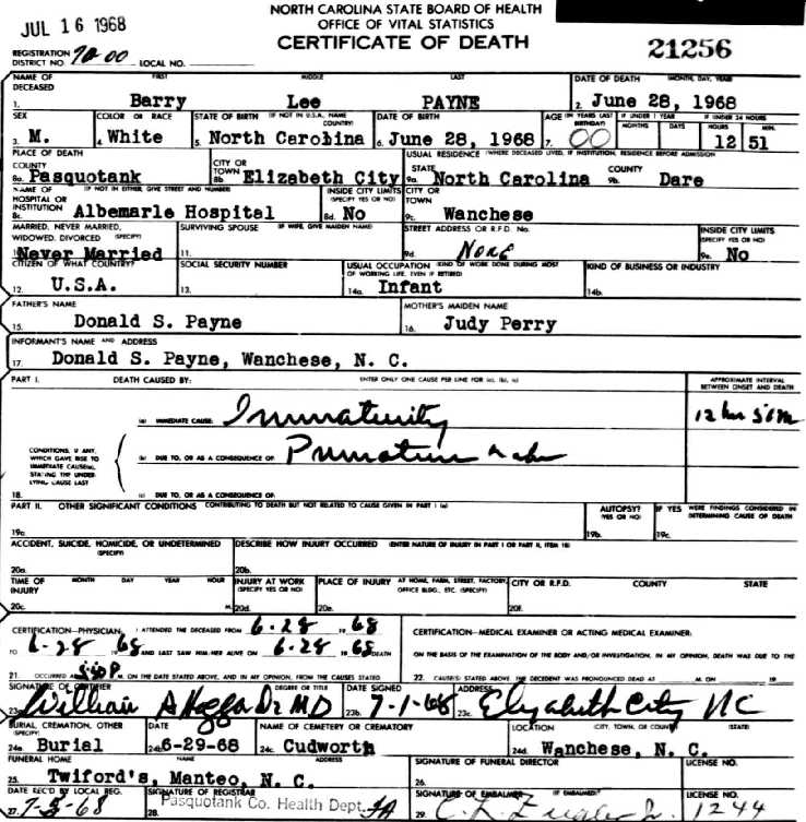| Basnight, Samuel Ray | Apr. 14, 1967 | Aug. 25, 1967 | Infant son of Boyd & June |