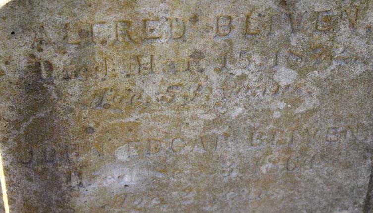 | Bliven, John Edgar | Sept. 3, 1864 | Age 2 years [triple with Alfred Bliven & Robert L. Bliven] [see closeup] [Footstone] [see a 2011 photo from Find-A-Grave] | |