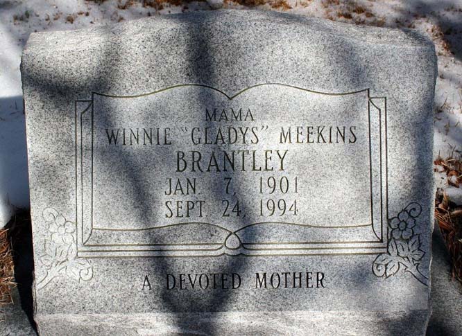 | Brantley, Winnie "Gladys" Meekins | Jan. 7, 1901 | Sept. 24, 1994 | Mama - A devoted mother [Backside of the tombstone] [see obituary] |