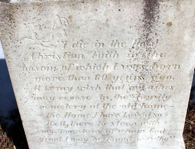 [see obituary] "I die in the Holy Christian Faith in the bosom of which I was born more than 60 years ago. It is my wish that my ashes may repose in the Family cemetery at the old home--the Home I have Loved so well, there to sleep with my Ancestors of whom God grant I be found worthy" |
