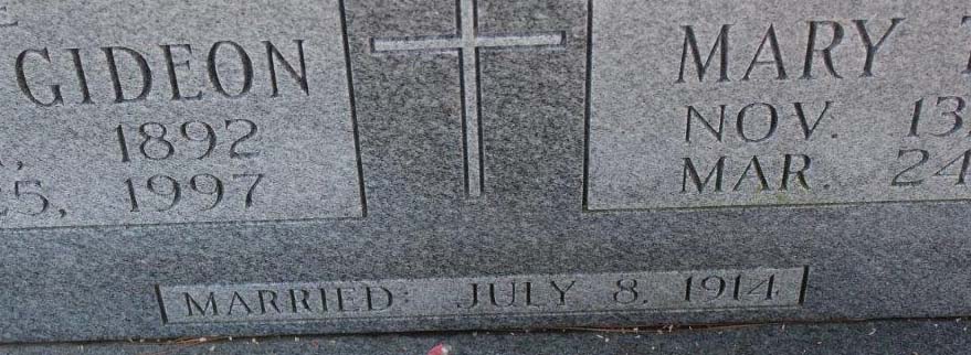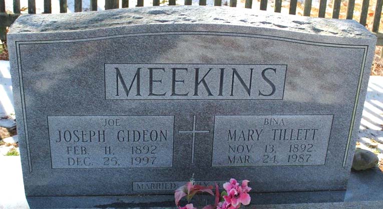 | Meekins, Joseph Gideon "Joe" | Feb. 11, 1892 | Dec. 25, 1997 | Married: July 8, 1914 [double with Mary Tillett Meekins] [Closeup of marriage date] [see obituary] |