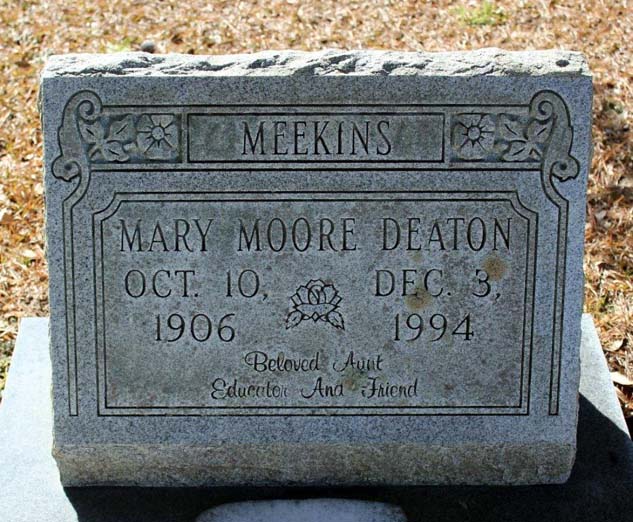 | Meekins, Mary Moore Deaton | Oct. 10, 1906 | Dec. 3, 1994 | Beloved Aunt - Educator And Friend [see obituary] |
