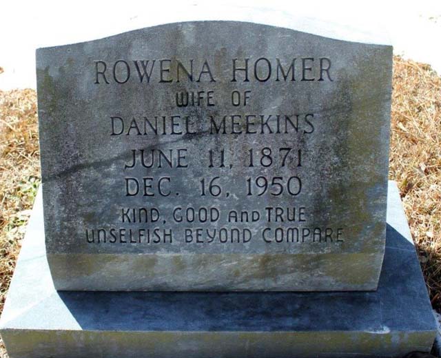 | Meekins, Rowena Homer | June 11, 1871 | Dec. 16, 1950 | Wife of Daniel Meekins - Kind good and true - Unselfish beyond compare |