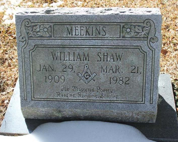 | Meekins, William Shaw | Jan. 29, 1909 | Mar. 21, 1982 | He mastered Poetry, Reading, Reciting, Sharing [Masonic Emblem] [see obituary] |