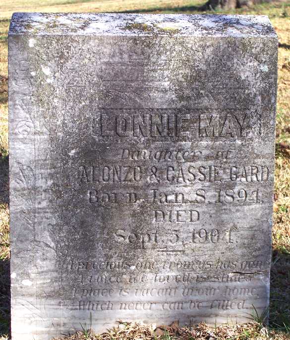 Daughter of Alonzo & Cassie Gard A precious one from us has gone, A voice we loved is stilled, A place is vacant in our home, Which never can be filled. Photo taken by Vickie Craddock in 2009 |