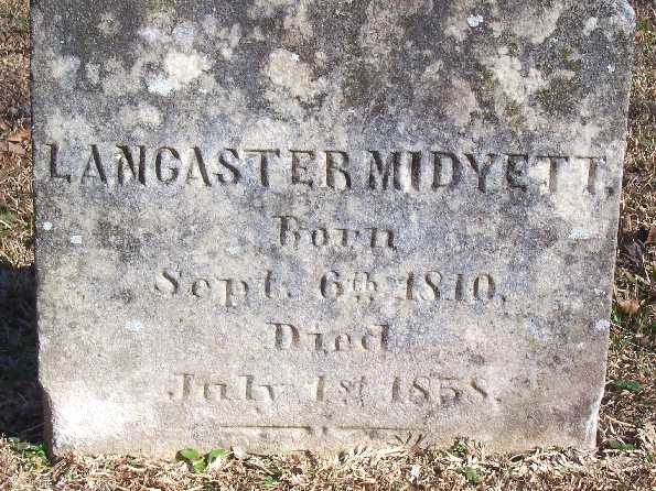 | Midyett, Lancaster | Sept. 6th 1810 | July 1st 1858 | Photo taken by Vickie Craddock in 2009 |