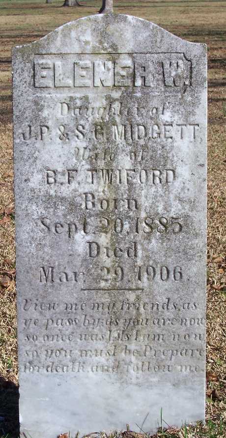 Daughter of J.P. & S.G. Midgett; Wife of B.F. Twiford View me my friend as ye pass by, as you are now so once was I; As I am now so you must be, Prepare for death and follow me. Photo taken by Vickie Craddock in 2009 |