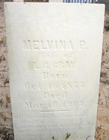 | Gray, Melvina P. | Oct. 16, 1877 | Mar. 10, 1907 | Wife of L.C. [Little Cyrus] Gray |