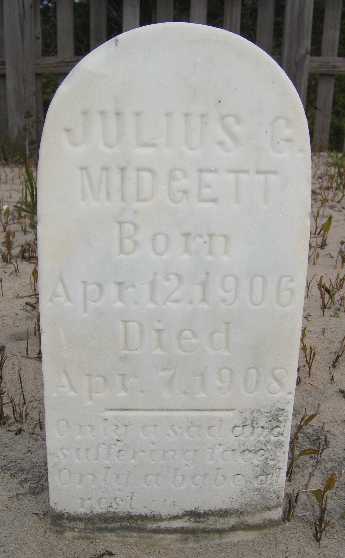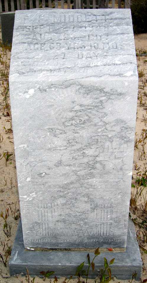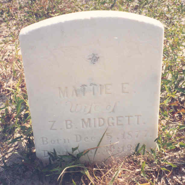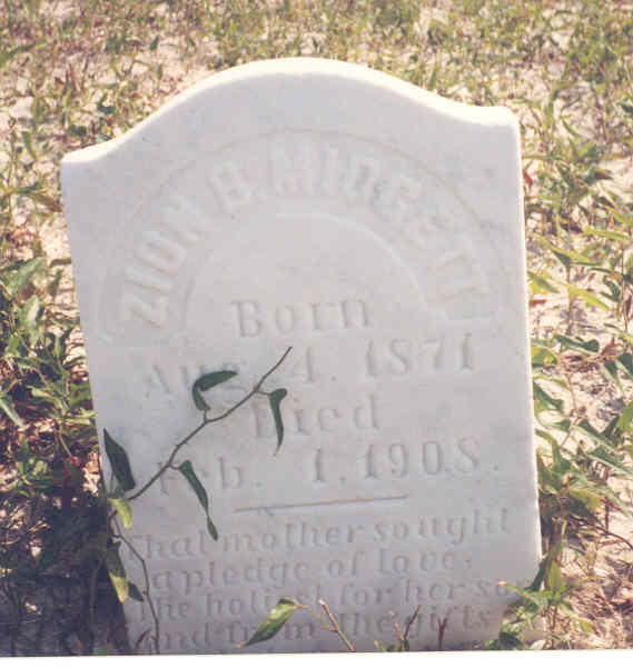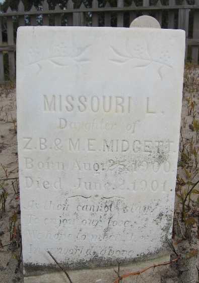 | Midgett, Missouri L. | Aug. 25, 1900 | June 2, 1901 | Dau. of Z.B. [Zion Bunyab] & M.E. [Martha "Mattie"] Midgett |