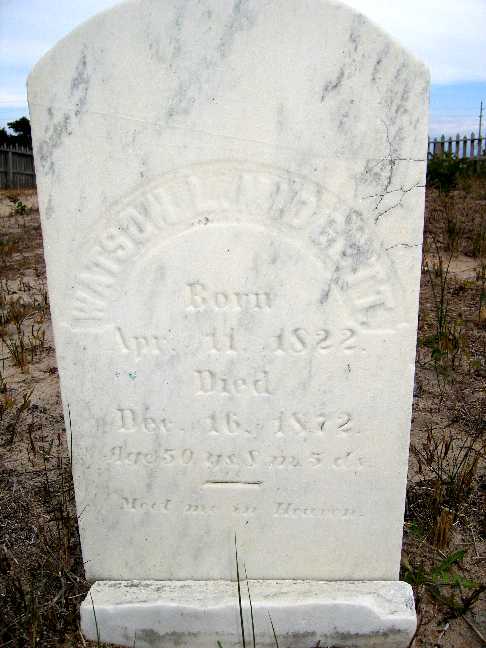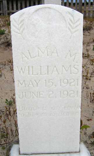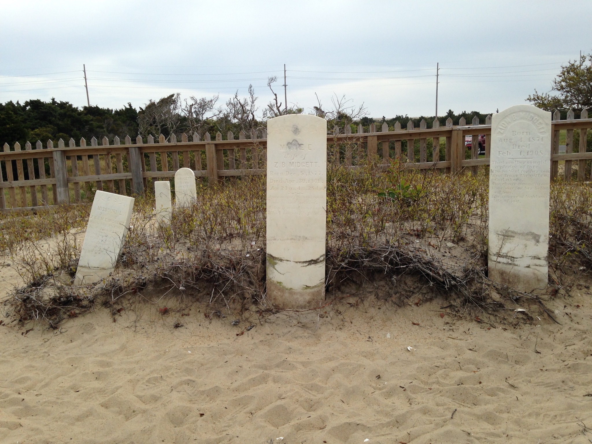 This cemetery is located in Salvo, Dare County, North Carolina. It's in the northwest corner of the National Park Service Campground on Hwy. 12. Some stones are broken and missing and some have sunk into the sand. Extra information is indicated in brackets. Click on underlined names for a picture of the tombstone. Photographs were taken by Ann Marie LaDue in April 2006. Some photographs were taken by Kay M. Sheppard in 1989 when some of the stones were nearly covered with sand but in 2006 were well above ground. If you would like to share photographs of tombstones from this cemetery please contact Kay Midgett Sheppard. See Google Maps for this cemetery.