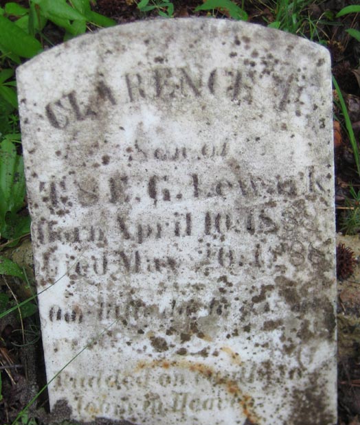 | Lewark, Clarence T. | April 10, 1888 | May 10, 1888 | Son of T. & E.G. Lewark - Budded on earth to bloom in Heaven. [Footstone] |