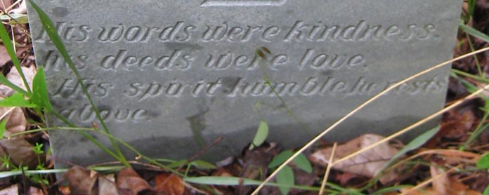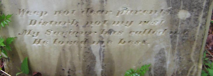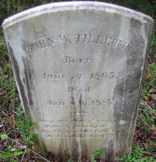 | Tillett, John W. | June 10, 1865 | Jan'y 10, 1885 | Weep not dear parents, Disturb not my rest, My Saviour has called. He loved me best. [Closeup] |