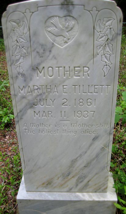 | Tillett, Martha E. | July 2, 1861 | Mar. 11, 1937 | Mother - A Mother is a Mother still. The holiest thing alive. |