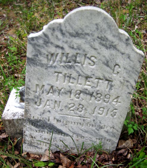 | Tillett, W. [William] J.D. | Dec. 31, 1892 | April 24, 1911 | Son of W.G. & M.E. Tillett - His words were kindness, his deeds were love, His spirit humble he rests above. [Closeup] |