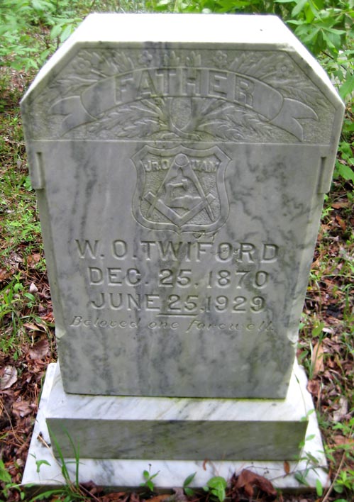 | Twiford, W.O. [William Otis] | Dec. 25, 1870 | June 25, 1929 | Father - Beloved one farewell. [Junior Order of United American Mechanics emblem] [Footstone] |