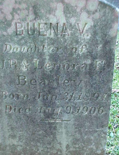 | Beasley, Buena V. | Jan. 31, 1891 | Aug. 9, 1906 | Daughter of J.R. & Lenora F. Beasley |