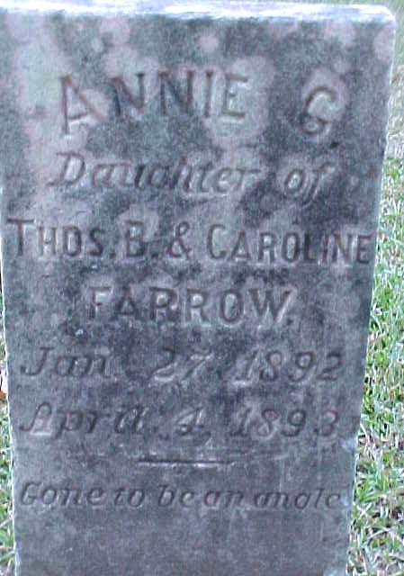 | Farrow, Annie G. | Jan. 27, 1892 | April 4, 1893 | Daughter of Thos. B. & Caroline Farrow |