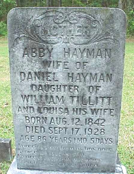 | Hayman, Abby | Aug. 12, 1842 | Sept. 17, 1928 | Mother; Wife of Daniel Hayman; Daughter of William Tillett and Louisa his wife; Age 86 Years 1 Mo. 5 Days |
