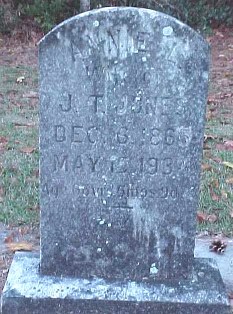 | Jones, Annie L. | Dec. 6, 1865 | May 15, 1932 | Wife of J.T. Jones; Age 66 yrs 5 mos 9 d |