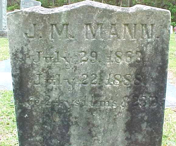 | Mann, J.M. | July 29, 1863 | July 22, 1888 | Age 24 ys 11 ms & 23 Ds [see Wm. Mann Bible] |