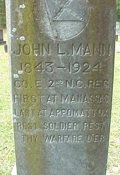 | Mann, John L. | [May] 1843 | [Nov. 17] 1924 | Co. E. 2nd N.C. Reg. First at Manassas; Last at Appomattox; Confederate Flag Emblem |