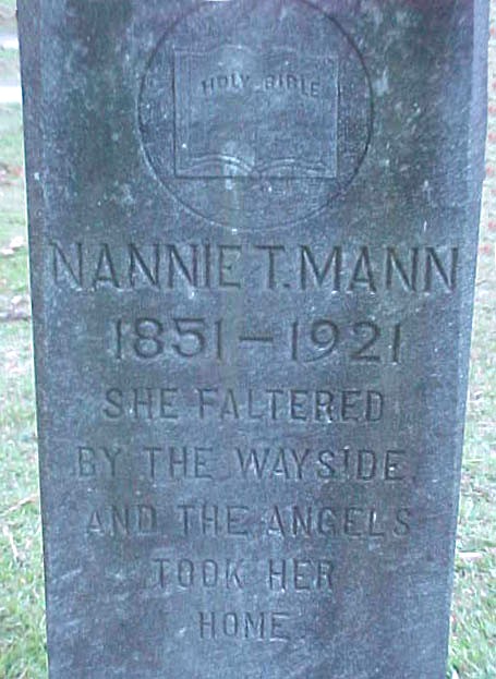 | Mann, Nannie T. | [Feb. 5] 1851 | [Oct. 16] 1921 | [2nd wife of John L. Mann] |