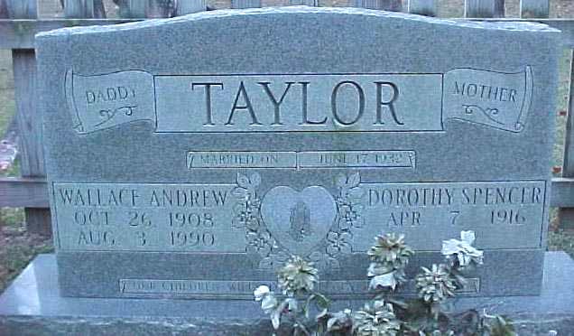 | Taylor, Wallace Andrew | Oct. 26, 1908 | Aug. 3, 1990 | Daddy; Married June 17, 1932; Our Children: Wiley, Lorina, Peggy, Bill & Tommy [double with Dorothy Spencer Taylor] |