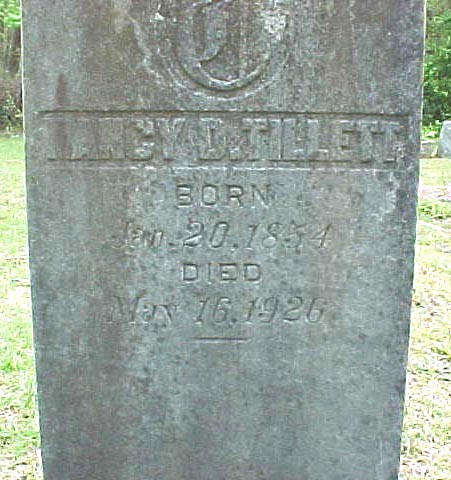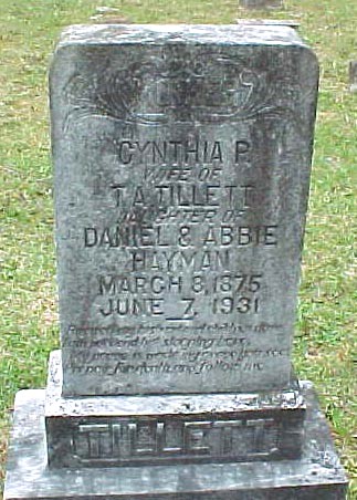 | Tillett, Cynthia P. | March 8, 1875 | June 7, 1931 | Mother; Wife of T.A. Tillett; Daughter of Daniel & Abbie Hayman |