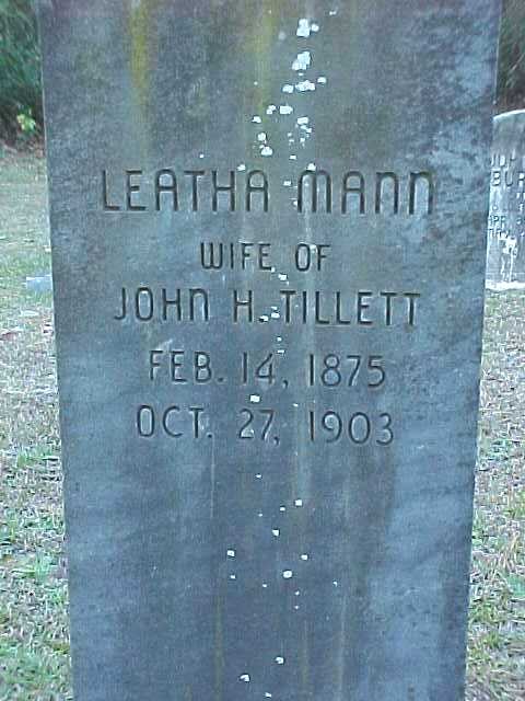 | Tillett, Leatha Mann | Feb. 14, 1875 | Oct. 27, 1903 | Wife of John H. Tillett |