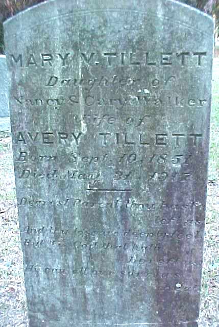 | Tillett, Mary V. | Sept. 10, 1851 | May 31, 1917 | Daughter of Nancy & Cary Walker; Wife of Avery Tillett |